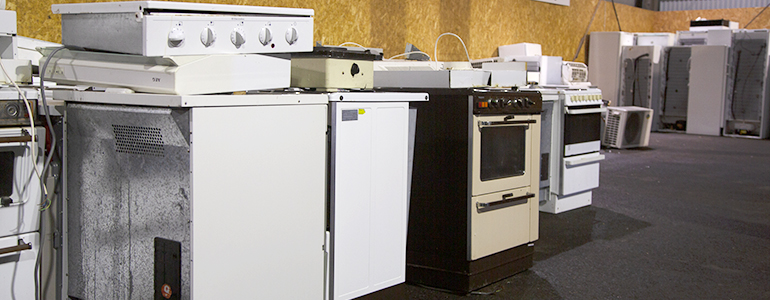Disk- och tvättmaskiner, spis, torkskåp,spisfläkt, mangel, kyl och frys. Sorteras under Farligt avfall.